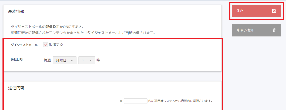 ダイジェストメールとは、過去1週間に公開されたコンテンツをユーザーに知らせるメールです。1週間のうち、いつ、どのようなメール文面で自動送信するかを設定できます。